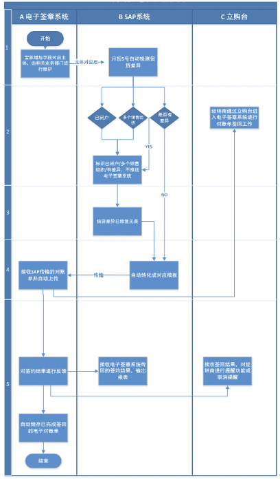 對賬單電子優(yōu)化模式:SAP自行檢測對賬單,并將檢測無誤后的對賬單自動上傳到電子簽章系統(tǒng)。經(jīng)銷商用任意母子賬號登入立購臺時,系統(tǒng)提示經(jīng)銷商有需要簽回的對賬單,并跳轉(zhuǎn)到電子簽章系統(tǒng)進行簽回工作。電子簽章系統(tǒng)將是否簽回結(jié)果反饋到立購臺,立購臺對其情況進行提醒或取消提醒操作。